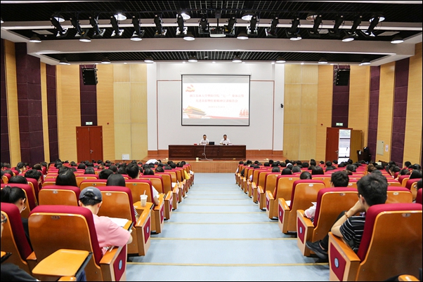 浙江省“红船精神”宣讲团成员、浙江工商大学马克思主义学院院长陈华兴教授为师生作“学习新思想 千万师生同上一堂课”——红船精神宣讲报告。陈教授从“红船精神”的产生和提出、“红船精神”的生成和发展逻辑、“红船精神”昭示着中国共产党人的“初心”、“红船精神”是中国革命精神之源 、“红船精神”的时代价值等五个方面详细解读了“红船精神”,并结合实际,用生动案例诠释了新时代师生党员如何更好立身与学习。