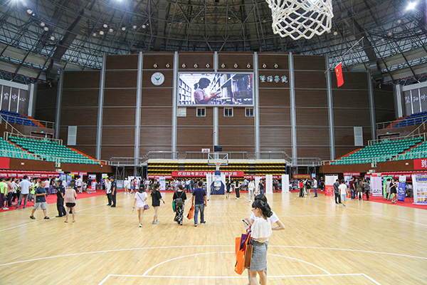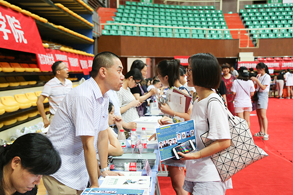 本网讯 7月11日上午,浙江省高招公益咨询会暨学校校园开放日活动在我院篮球馆顺利举行。浙江、江苏、上海等省(市)100余所高校面向诸暨和周边地区考生、家长开展高招招生咨询,发放招生宣传材料等活动。