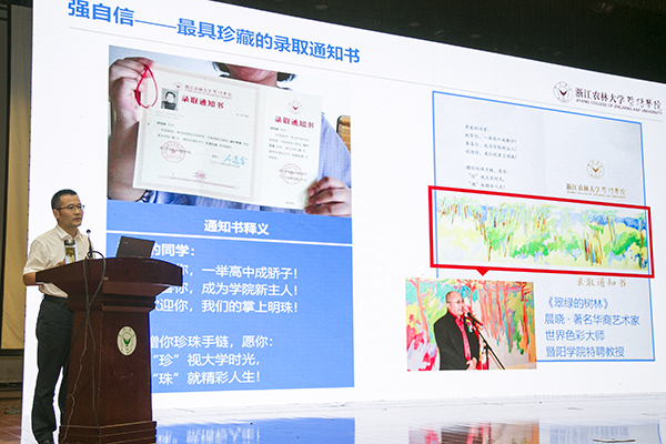 在“读大学,首先做到强自信”篇章,潘国忠从中国自信、科技自信、教育自信等四个维度讲述了中国速度和国民骄傲,从农林自信、暨阳自信、二级学院自信方面讲述了人才培养、平台建设、师资力量、学科专业和校园文化的优势和成效,鼓励暨阳学子要自强自信、敢于超越。