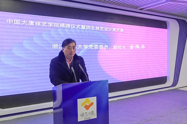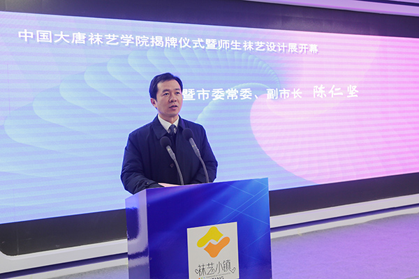 本网讯 1月5日上午,中国大唐袜艺学院在诸暨大唐“袜艺小镇”揭牌成立。浙江农林大学副校长金佩华,诸暨市委常委、副市长陈仁坚,学院领导石道金、李文莉、李叔君,大唐镇领导田海斌、王其军、吕靖江、周骆永等出席仪式,学院有关职能部门、各教学单位负责人及师生代表,诸暨市相关行业协会负责人、袜业企业家代表等参加仪式。