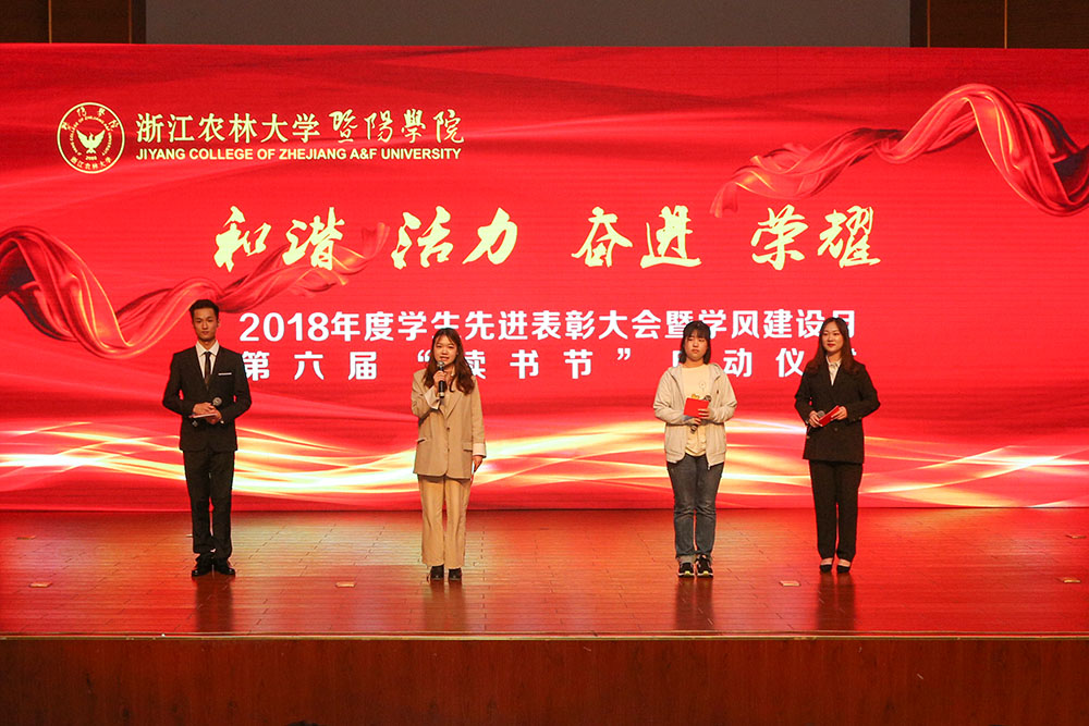 4月22日晚,浙江农林大学暨阳学院2018年度学生先进表彰大会暨学风建设月、第六届“读书节”启动仪式在学院明珠报告厅举行。必赢766net手机版党政班子成员,诸暨团市委副书记何威出席活动。学院全体中层干部、辅导员和学生代表参加活动。