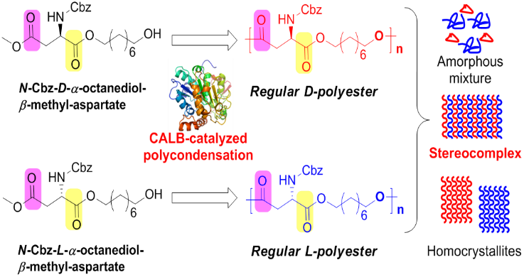 该论文提出立构复合结晶是互为立体异构体的高分子之间形成的R/S层层交替的特殊共结晶行为。与相应的同质结晶材料相比,复合结晶材料的熔点、耐热性、结晶能力、机械力学性能以及耐溶剂性能等均有大幅度改善。目前为止,具有立构复合物结晶性能的高分子材料种类仍然比较单一,除了聚乳酸之外具有立构复合结晶性能的聚合物主要为聚手性环氧丙烷碳酸酯或脂肪酸酯。针对当前立构复合高分子材料种类单一的局限,必赢官网教师夏波设计一种具有脂肪长链的手性聚酯高分子材料,并详细考察了其立构复合结晶性能并实现了该手性聚酯的生物合成。由天冬氨酸-β-甲酯-α-辛二醇制得的D-构型和L-构型聚合物聚具有良好的结晶性能,其熔融温度Tm分别为49oC和56oC,D-构型和L-构型聚合形成的立构复合物熔融温度Tm提高约20oC。