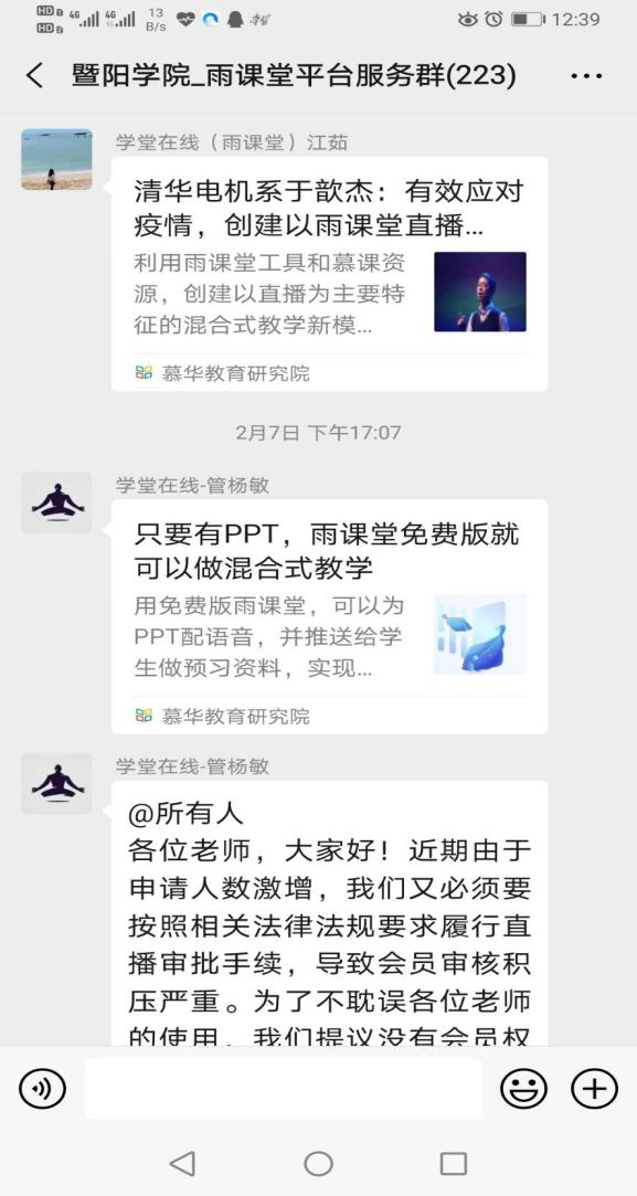 为保障线上教学的质量,帮助广大教师尽快掌握“互联网+教学”基本技能和要求,学院教务部安排专人负责线上教学安排及培训工作,汇总各类资源并及时在学院教务群中分享,建立平台培训群组织教师加入,协助平台客服人员为教师开展线上培训工作,对拟实施在线教学的教师进行指导,解答教师在使用平台过程中出现的问题,为教师快速熟悉掌握教学平台功能和教学工具的使用方法提供了保障。