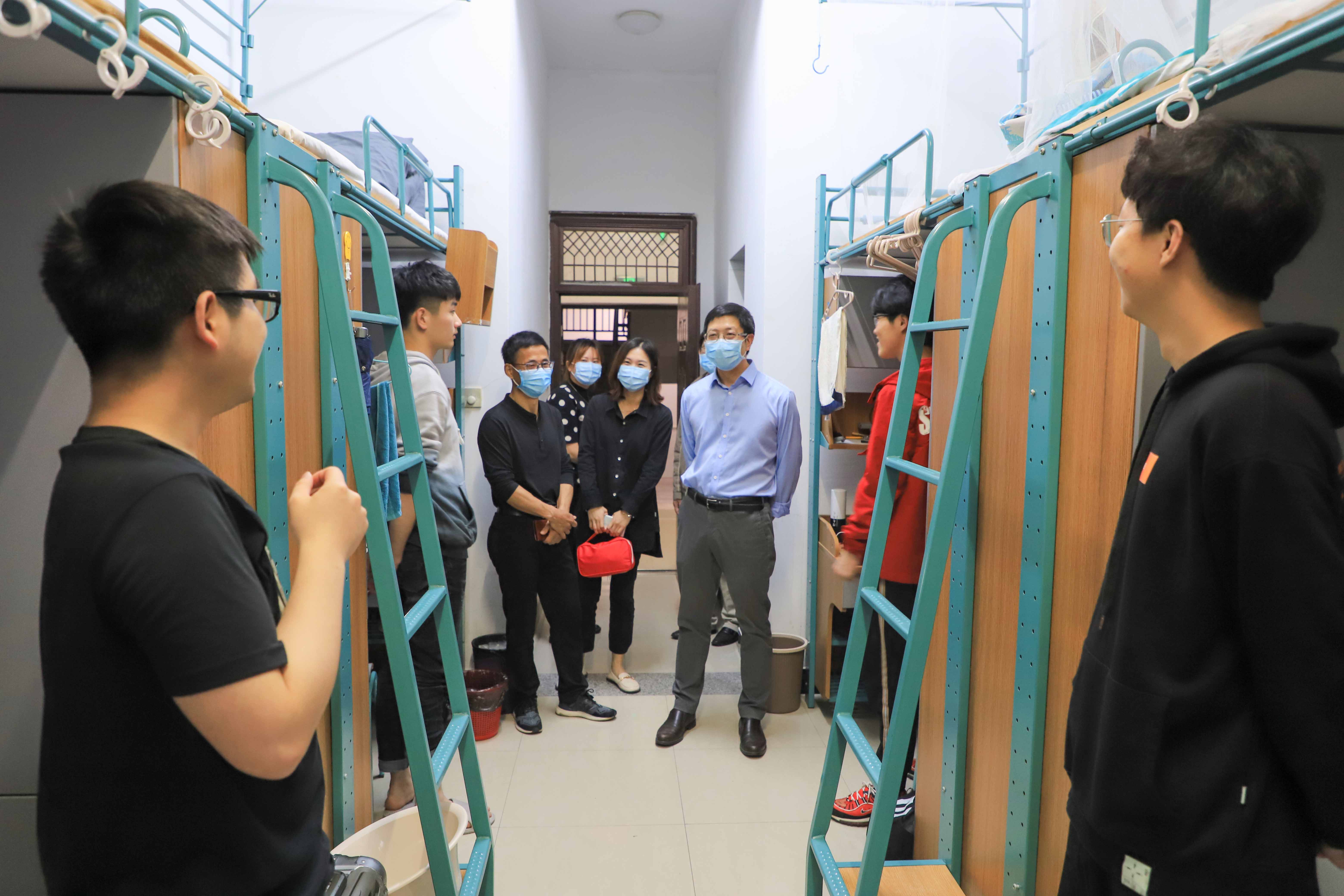 在毕业生寝室,学院领导了解同学们的毕业论文进展、升学考试和参加就业招聘、招考情况,勉励毕业班同学克服疫情带来的影响,迎难而上,利用线上线下渠道主动出击,积极就业。