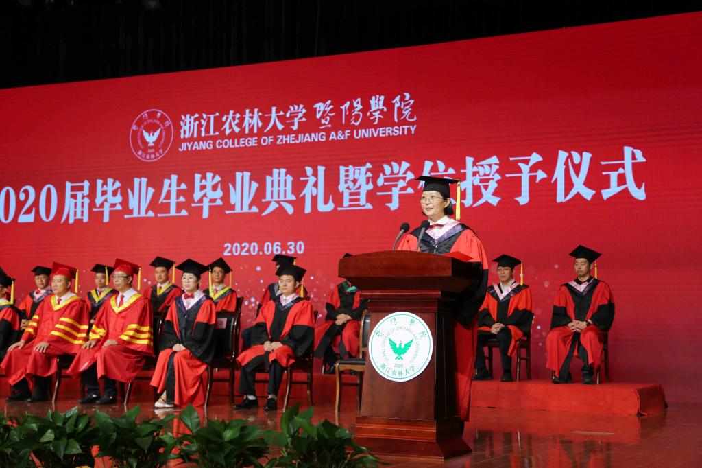 副院长李文莉宣读了《浙江省教育厅办公室关于公布2020届浙江省普通高等学校优秀毕业生名单的通知》和《必赢766net手机版关于表彰2020届优秀毕业生的决定》。主席台就座领导和学位评定委员会委员为优秀毕业生代表颁发荣誉奖杯。