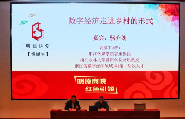 同期,邀请了浙江传媒学院客座教授、浙江省数字经济领域151第二层次人才骆介朗为师生讲授《数字经济走进乡村的形式》、浙江大学对外经济技术贸易有限公司高级工程师赵昌苗为师生讲授《三十四年商贸实践的感悟和经验分享》,提升商院师生理论武装,结合商院专业促使党史教育转化为服务学院和地方的有效成果。