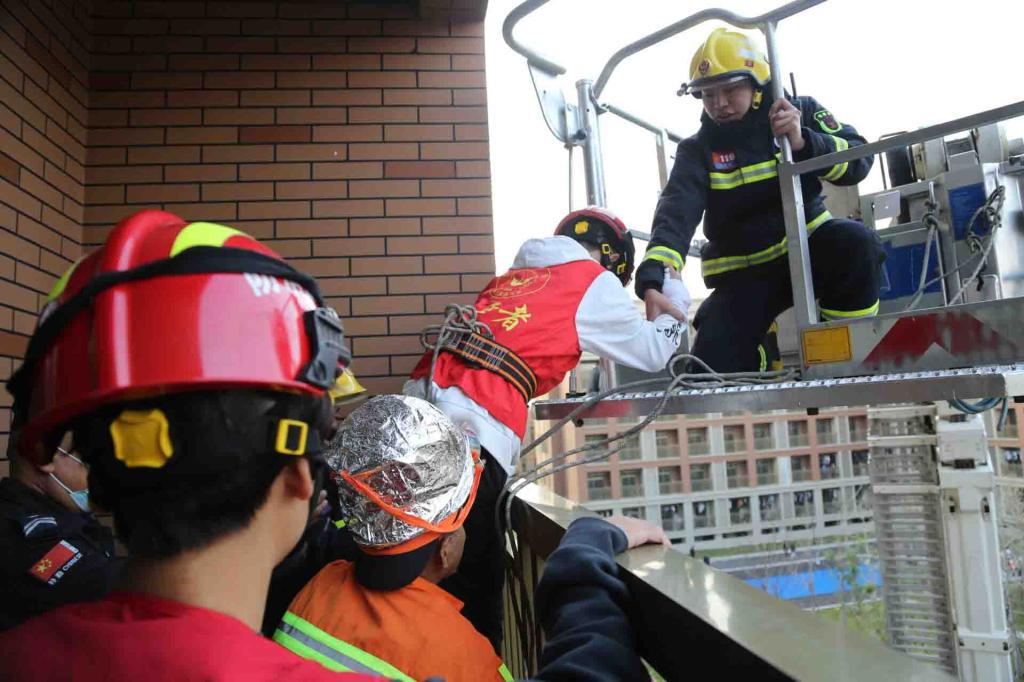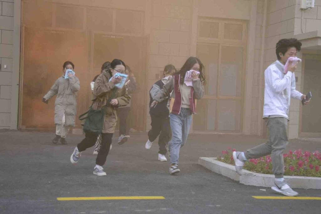 随后,徐光辉宣布消防疏散演练及灭火操作培训活动开始。学生公寓模拟着火点浓烟四起,学生发现火情后紧急呼救,立即拨打“校园110”并向119报警,学院迅速启动突发事件应急处置预案。2名公寓指导员作为第一灭火力量到达现场开展救援,楼层疏散引导员指挥学生用湿毛巾捂住口鼻快速有序撤离。微型消防站人员作为第二灭火力量紧急到达现场开展灭火救援。消防官兵接到报警后,迅速出警组成第三灭火力量进行救援。一组队员利用水罐消防车和室内消火栓对火势进行压制,掩护救援组深入火场救人,医务人员对受伤人员实施救治;另一组队员利用云梯车对被困人员实施高空营救。经过十余分钟的救援行动,快速扑灭了火情,成功救援出了被困人员,赢得了在场师生的掌声。