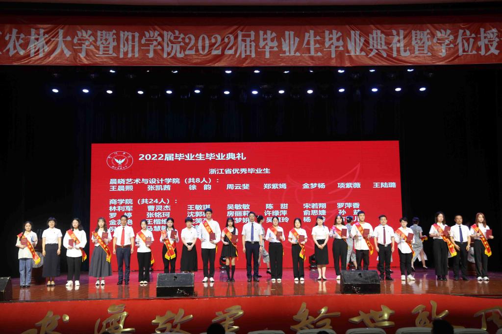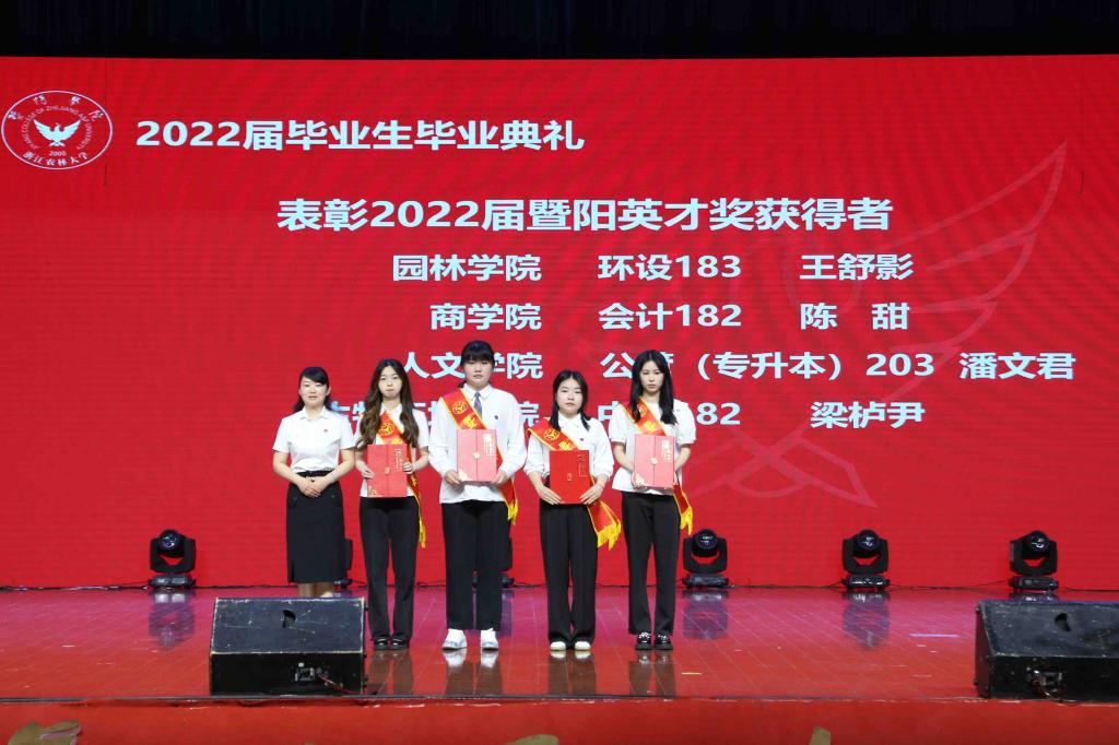 主席台领导为毕业生代表颁发毕业证书,为优秀毕业生代表和暨阳英才奖学金获得者颁发荣誉奖杯。