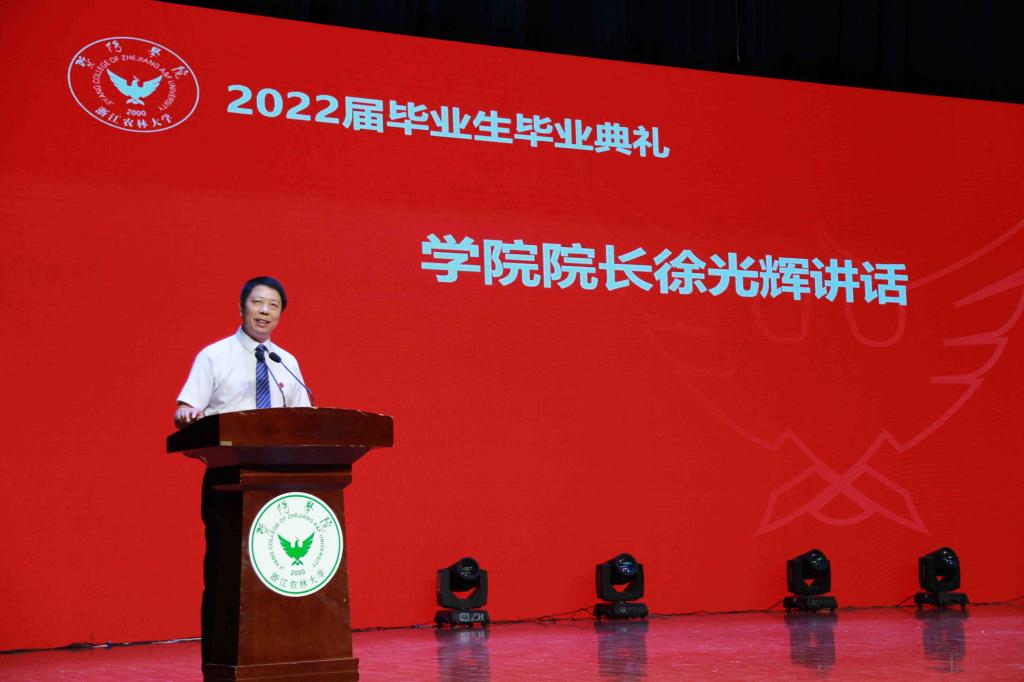 徐光辉作题为《在青春的赛道上奋力奔跑》的讲话,代表学院向参加此次典礼的2203位毕业生,表示最热烈的祝贺和最殷切的期盼!并深情回顾了四年来同学们的成长、进步、变化和学院发展取得的成绩。徐光辉在离别之际,为毕业生送上了最真挚的祝福和最殷切的期盼。他希望,一是要不忘来路,坚守初心。善于从走过的路中汲取智慧、提振信心、增添力量,要在实现中国梦的生动实践中走好未来一步,为梦想勇往直前。二是要坚定去路,踔厉奋发。要有“主人翁”意识,敢于做“硬核”青年,在今后的工作生活中继续发扬“坚韧不拔,不断超越”的农林精神,践行“求真敬业,经世致用”的暨阳院训,坚定信念,接续奋斗,接好时代赋予你们的接力棒。三是要开拓新路,勇毅前行。要牢记党的教诲,立志民族复兴,不负韶华,不负时代,不负人民,在创新创业中走在前列,在平凡岗位上奋勇攀登,在青春的赛道上奋力奔跑,争取跑出当代青年的最好成绩!