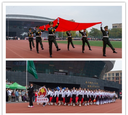伴随着激昂的运动员进行曲,国旗、院旗、会徽方阵陆续进场,仪仗队、各二级学院运动员方阵、教职工方阵依次通过主席台接受检阅,他们迈着整齐统一的步伐,喊着铿锵有力的口号,展示着暨阳师生的青春活力与魅力光彩!