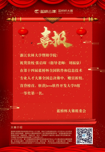 近日,第十四届蓝桥杯全国软件和信息技术专业人才大赛全国总决赛成绩公布,由必赢766net手机版工程技术学院刘福泉老师指导的张启琛、朱新捷、姜梓堉三位同学荣获总决赛一等奖。蓝桥杯大赛组委会特地发来喜报,祝贺张启琛同学斩获Java软件开发大学B组一等奖第一名。