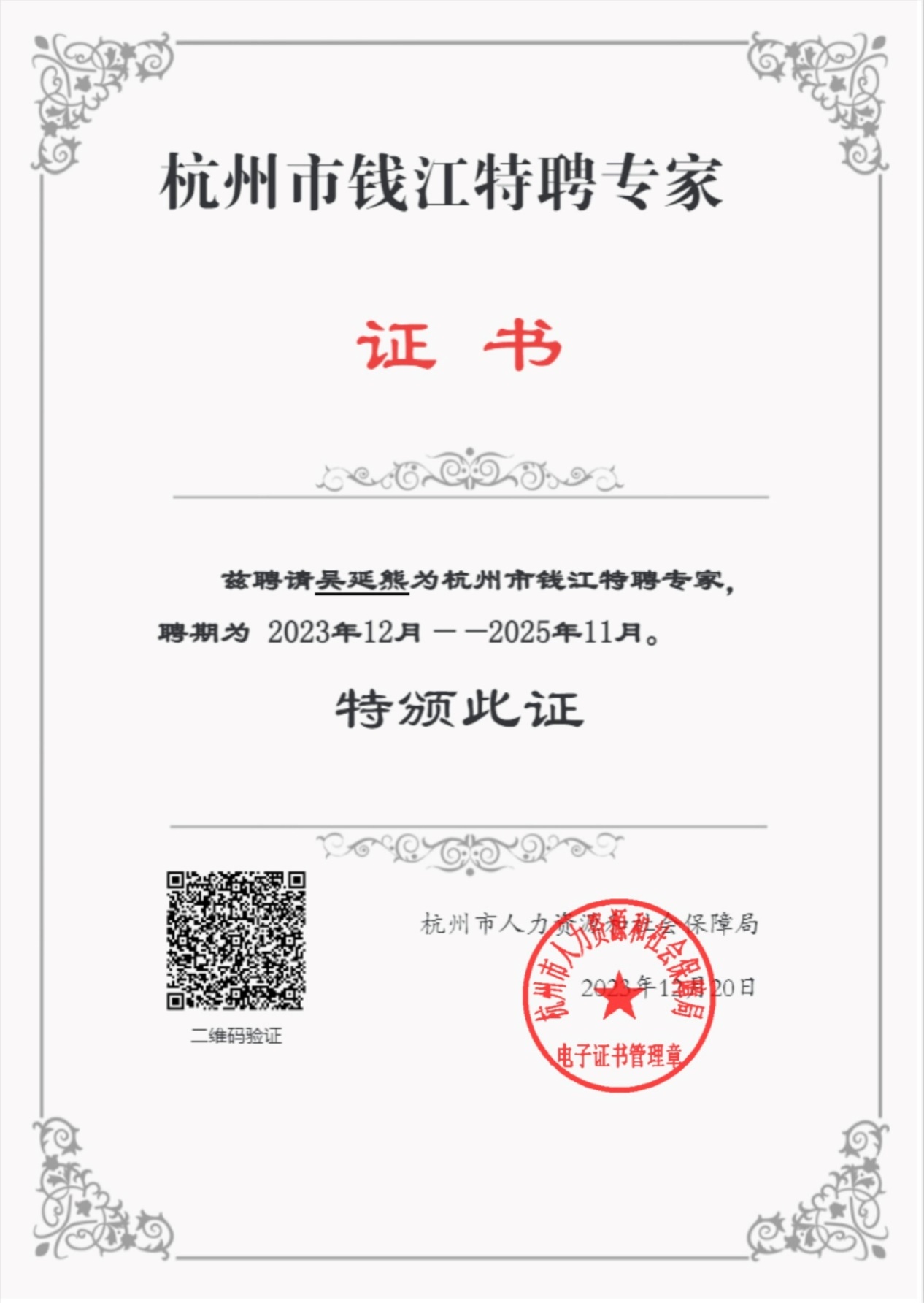 必赢官网教授吴延熊荣获“杭州市钱江特聘专家”称号