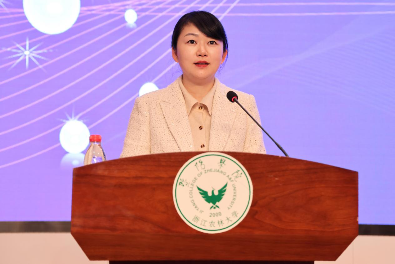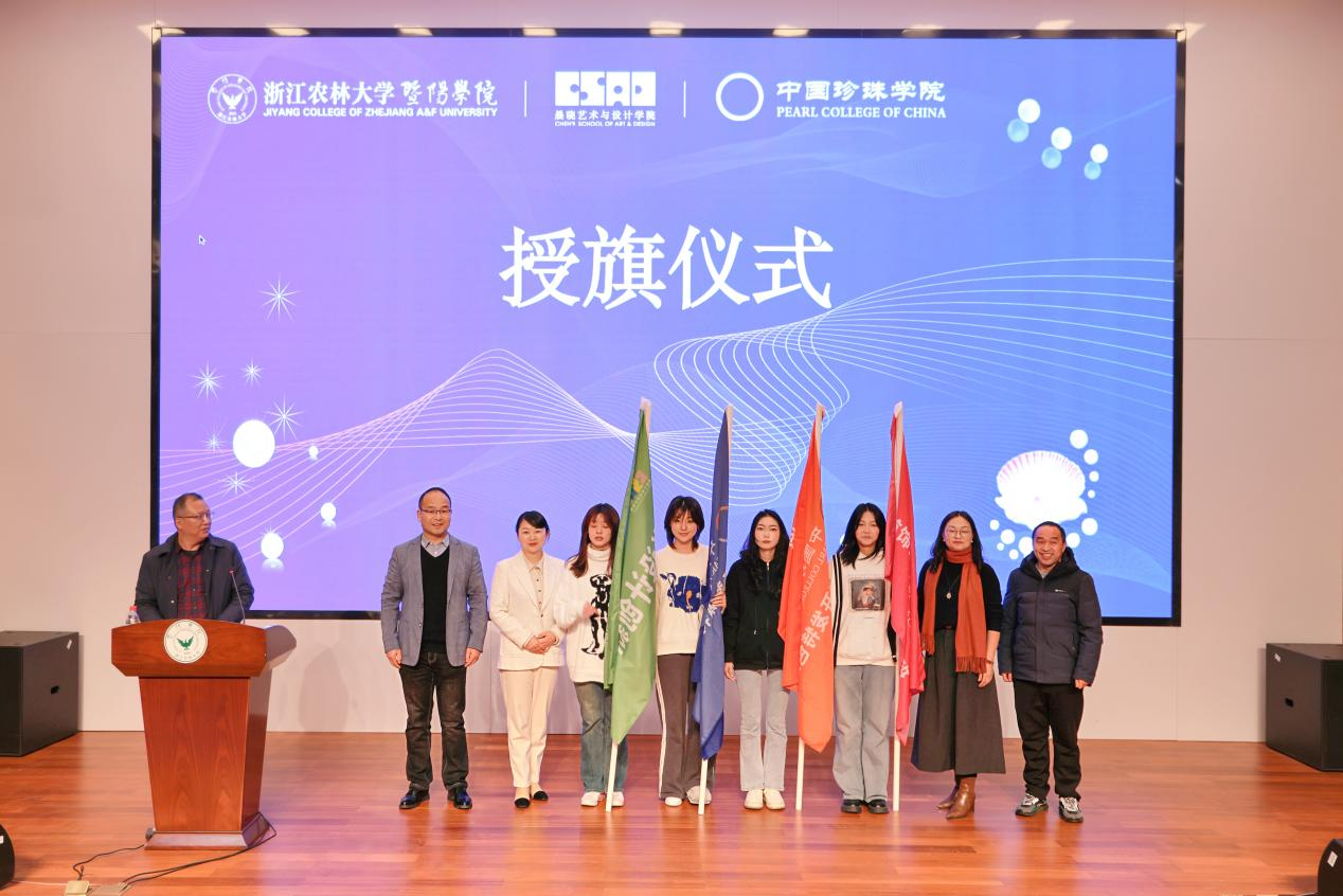 洪昀,晨晓艺术与设计学院(中国珍珠学院)、商学院党总支、生物环境学院负责人共同为产业班授旗。