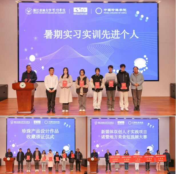 仪式上还颁发了2023年度中国珍珠学院产业班暑期实习、实训先进个人证书,2023年度中国珍珠学院永久收藏证书和新媒体双创人才实践项目获奖证书。