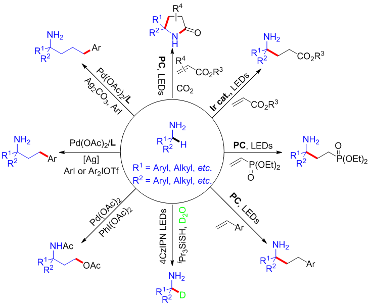 碳-氢键的官能团化是修饰现有分子的一种最有效,最直接的方法。在现代有机合成中,脂肪族伯胺位置选择性的sp3碳-氢键官能团化是一项最具有挑战性的工作,已经受到化学家们的广泛关注。通过自由基反应历程,采用光氧化还原催化剂及氢原子转移策略可以实现脂肪族伯胺α-碳(sp3)-氢键的官能团化;另外,利用过渡金属钯催化剂也能实现脂肪族伯胺γ-和δ-碳(sp3)-氢键的官能团化。