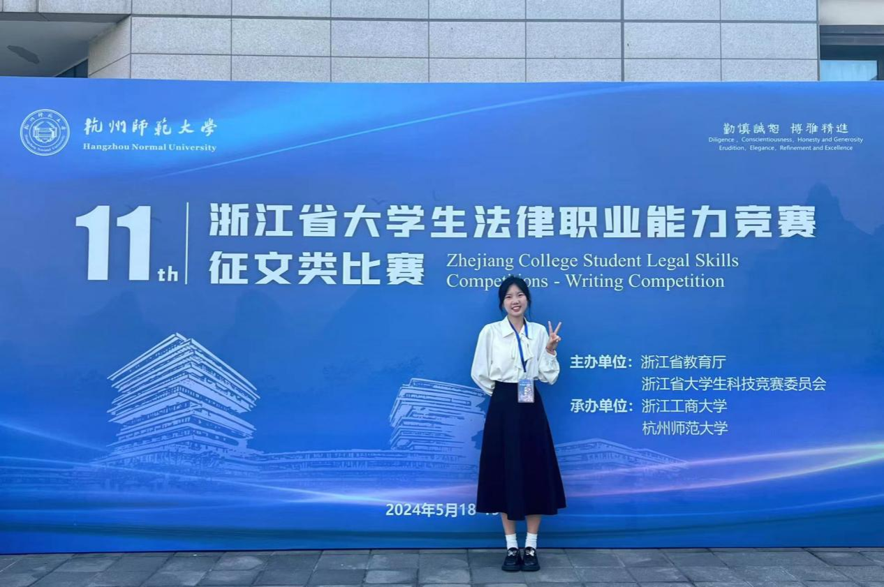 5月18日至19日,由浙江省教育厅、浙江省大学生科技竞赛委员会主办的浙江省第十一届大学生法律职业能力竞赛征文类决赛在杭州师范大学举行线下答辩。人文学院法学221班学生厉悦凝在相关教师指导下,以位次第五的好成绩获得一等奖,创造人文学院法学专业省级学科竞赛一等奖新纪录。