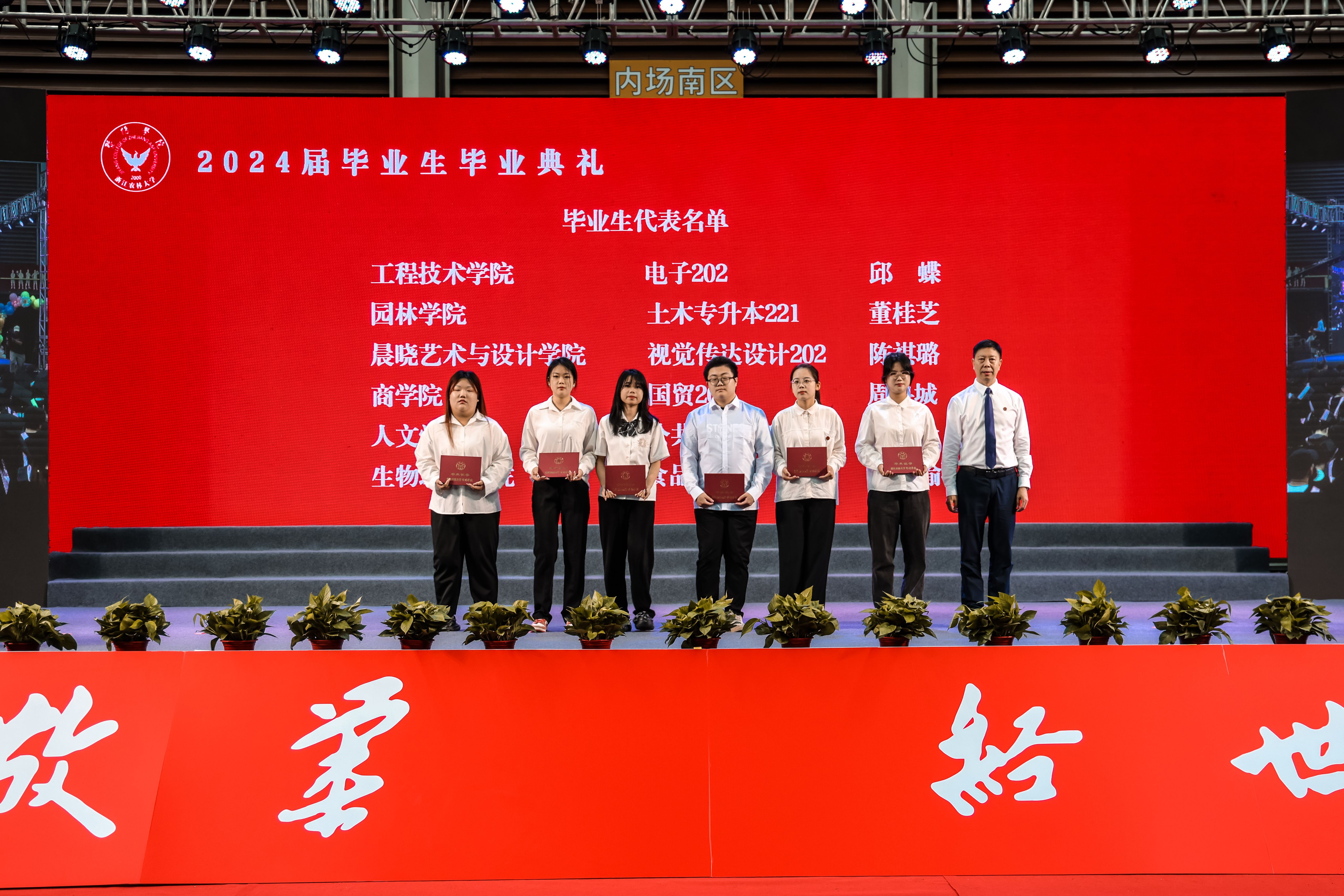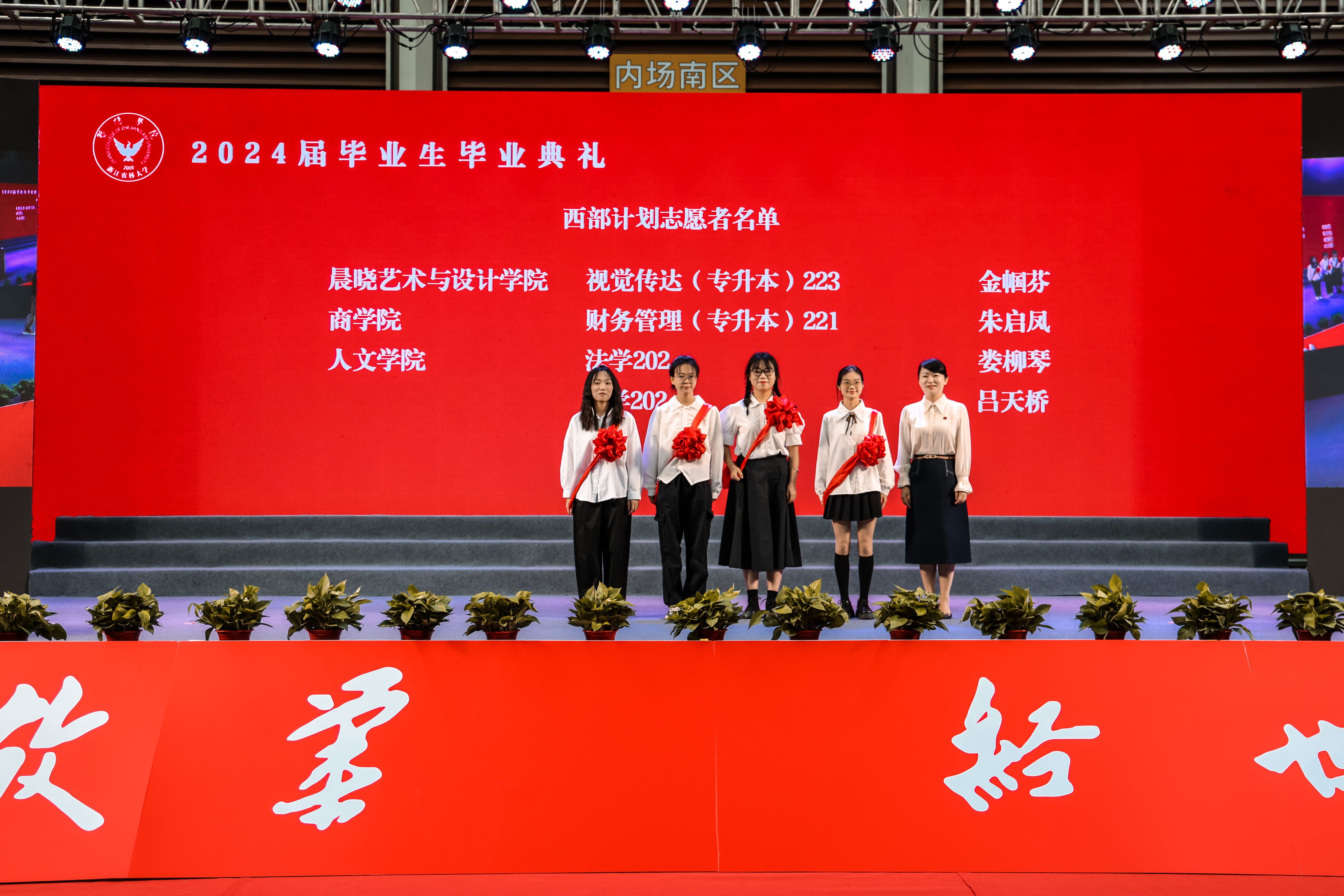 学院院长徐光辉为毕业生代表颁发毕业证书。学院党委书记洪昀为参与西部计划的学生佩戴红花。学院领导为2024届优秀毕业生颁奖。