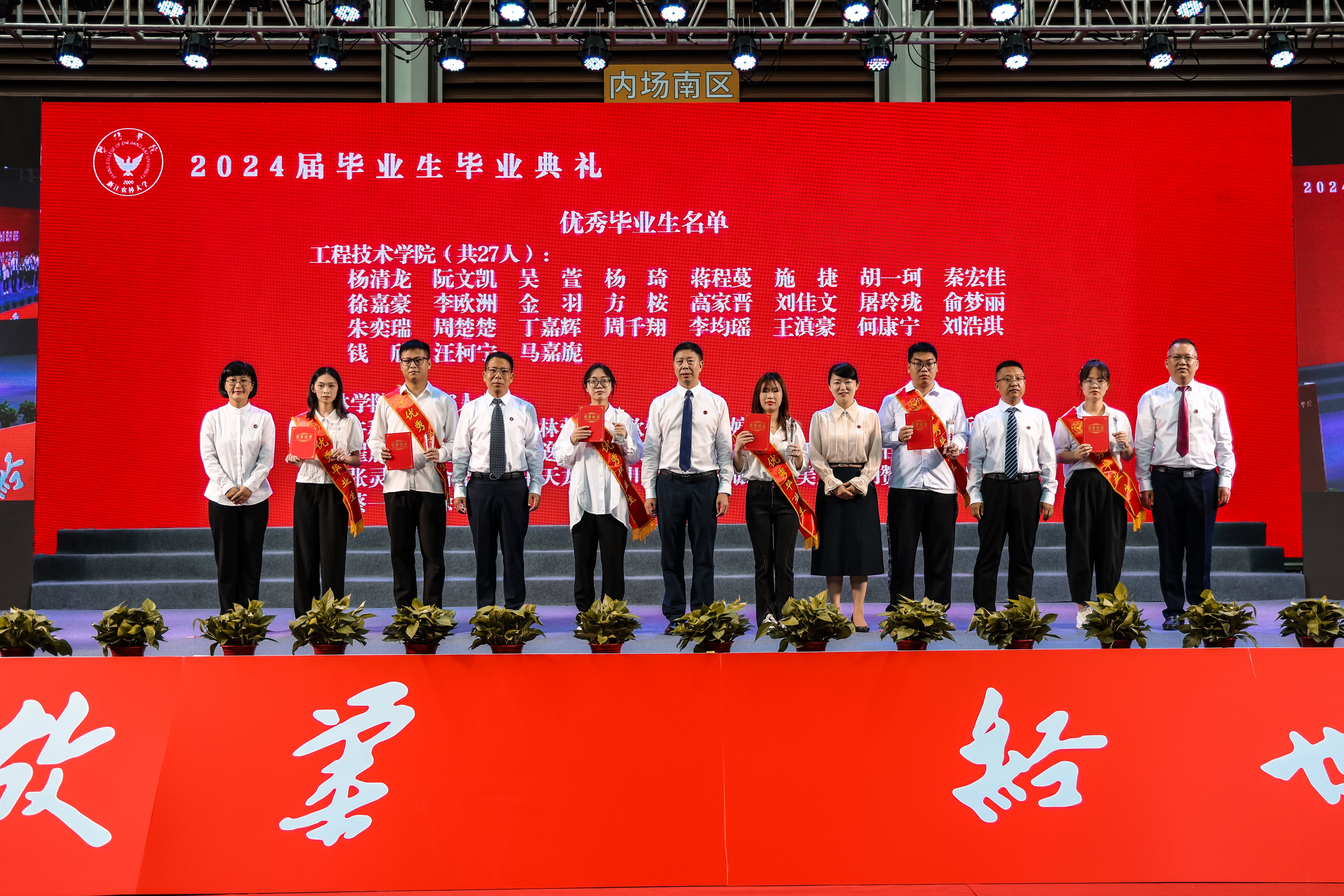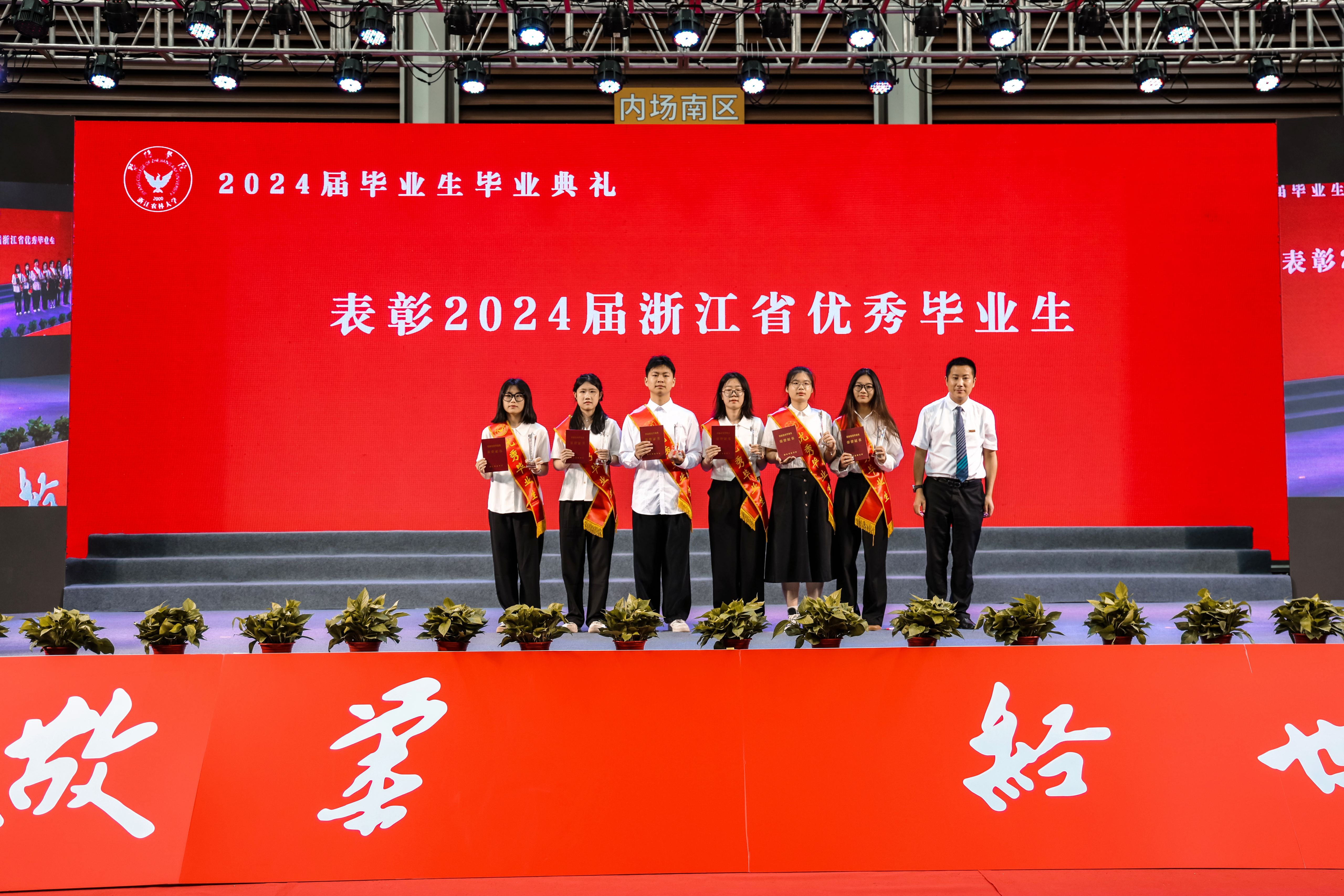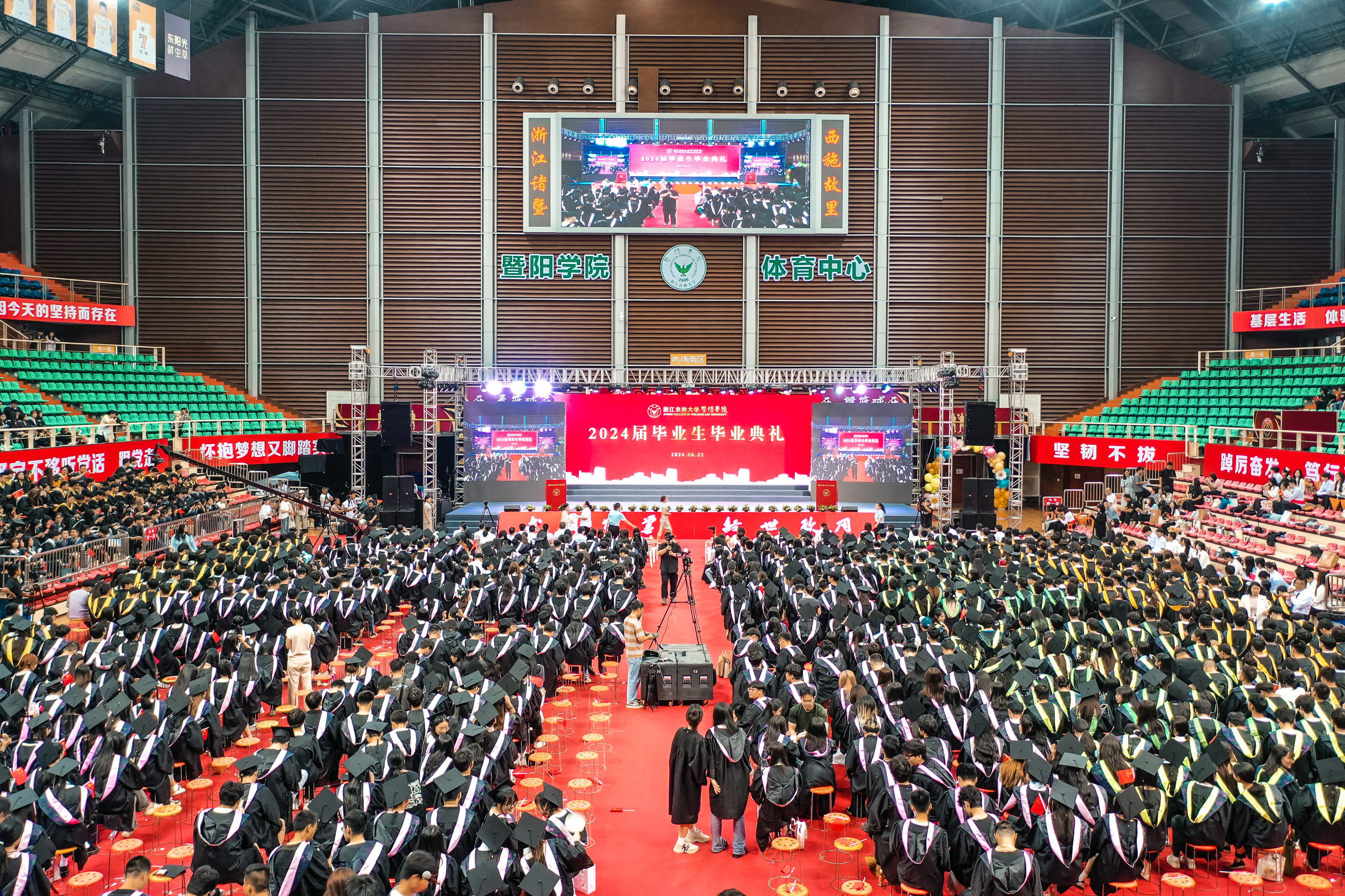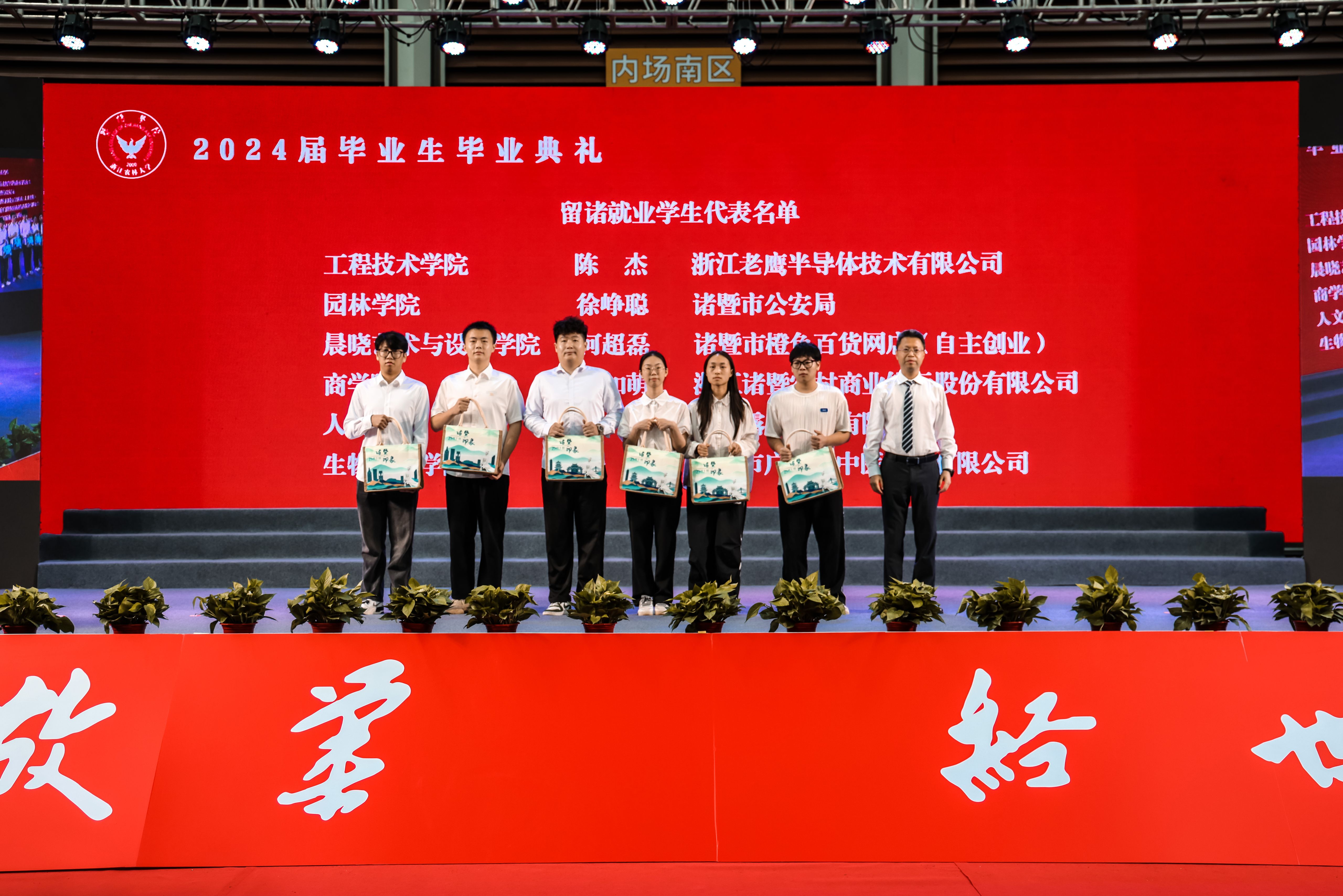 随着雄壮的国歌声响起,毕业典礼正式拉开帷幕。典礼上,朱斌为2024 届暨阳英才奖获得者颁奖。徐爱俊为省级 2024 届优秀毕业生代表颁发证书和奖杯。陈文进为留在诸暨就业的毕业生代表赠送了纪念品。