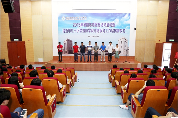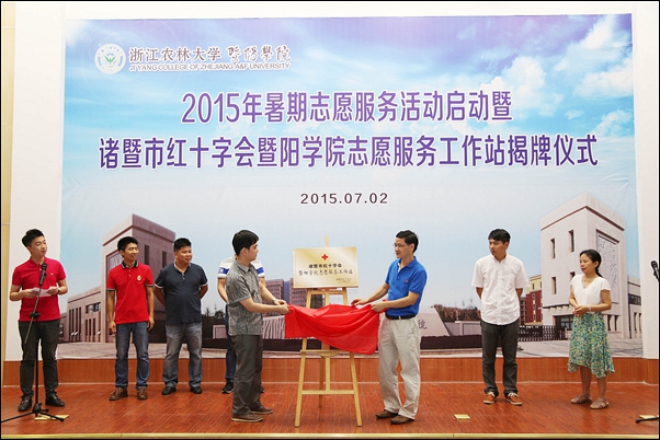 仪式上,办公室负责人和诸暨市红十字会执委会副主任共同为诸暨市红十字会必赢766net手机版“志愿服务工作站”揭牌;学工部、团委相关负责人宣读了2015年暑期社会实践立项团队名单,并作了安全培训。