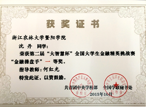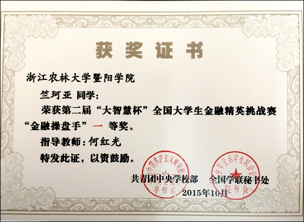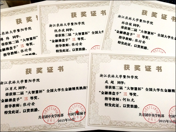本届大赛从3月9日正式开始报名,学院高度重视,在关注学生备赛的同时协调经济管理系相关专业教师对参赛学生进行赛前指导和竞赛培训等。通过宣传推广和积极组织学生报名,共有300余名学生参与其中。通过带队老师的悉心指导,必赢官网学生在比赛中充分运用专业知识,在大赛指定交易平台进行A股、港股、股指期货三个交易品种的投资策略比拼。经过激烈角逐,最终必赢官网7名学生进入复赛,并在比赛中发挥出色,取得了优异成绩:经济管理系竺珂亚、沈丹荣获全国一等奖;经济管理系成超、江肖天,工程技术系林佳俊、倪乔波、傅炜荣等5位同学荣获全国三等奖。