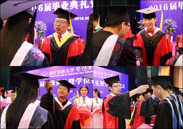副院长修树东宣读了浙江省教育厅和必赢766net手机版关于表彰2016届优秀毕业生的决定。主席台就座领导为学院优秀毕业生代表颁发荣誉证书,为毕业生代表颁发毕业证书和学位证书,扶正流苏。