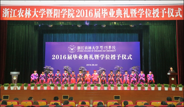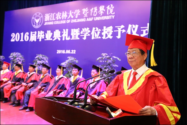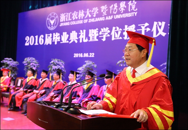 院长石道金发表讲话。他代表学院向圆满完成学业的2016届毕业生表示热烈的祝贺,向精心教育同学们的老师、辛勤养育同学们的父母致以崇高的敬意,向关心关爱同学们的社会各界、浙江农林大学、诸暨市委市政府表示衷心的感谢。并同在场的全体毕业生一起总结回顾了过去四年学院为培养学生所进行的教育教学改革,以及学生为学院改革、建设、发展所作出的努力和贡献,对同学们取得优异成绩和精彩表现给予充分肯定、感谢和祝贺。
