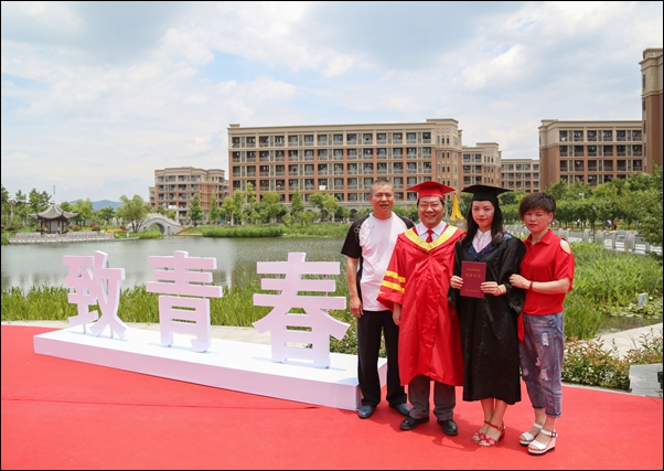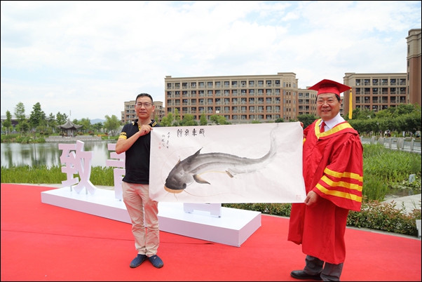 典礼仪式结束后,孙优贤院士和学院领导来到天目湖边,同毕业生和家长们合影留念。“追梦想、致青春、爱暨阳”、“巨型毕业证书”、“不拍照、不毕业墙”在学院为毕业学子们精心设计的毕业留影区,穿着学士服的毕业生们纷纷拿起相机、手机和自拍杆,在生机盎然的校园里同院士、院长、书记合影,留下人生最难忘的一刻。毕业生家长也纷纷参与其中,国际经济与贸易121班李吉同学的父亲还现场向学院捐赠自己所绘书画作品,以表对孩子的栽培之恩,祝愿学院未来发展更美好。
