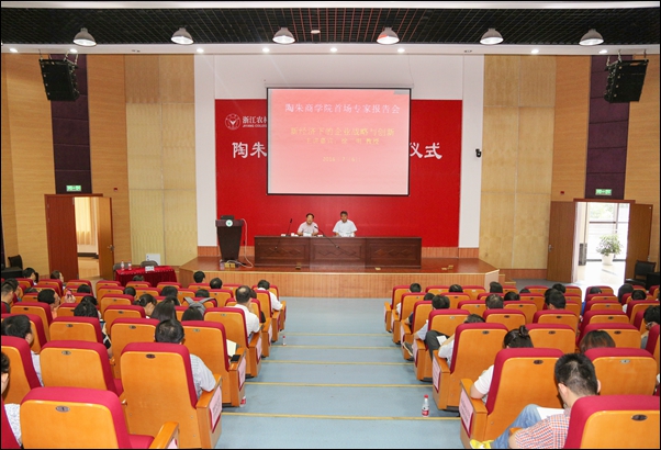 揭牌仪式后,举行了陶朱商学院首场报告会。中国人民大学商学院徐二明教授受邀作了题为《新经济下的企业战略与创新》的报告,从新经济及其政策点、企业的战略思考和企业如何创新三个方面展开阐述,具体介绍了新经济的内涵、基本特征、培育政策着力点,以海尔公司、联想集团、中国电信等企业的整体创新改革思路为例,讲解了企业的战略思考,并结合诸暨市创新政府支持体系,分析了观念变革、流程变革、结构变革和机制变革,指出要以创业精神、开放精神、学习精神,转变观念,实现新经济下的企业创新。
