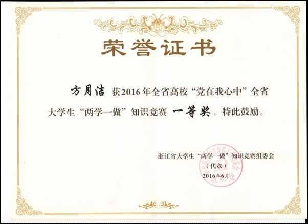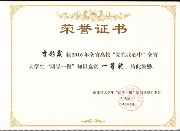 本网讯 日前,从浙江省大学生“两学一做”知识竞赛组委会获悉,“党在我心中”全省大学生“两学一做”知识竞赛顺利落幕。必赢官网园林艺术系方月洁、人文系李彩霞两位同学荣获一等奖。