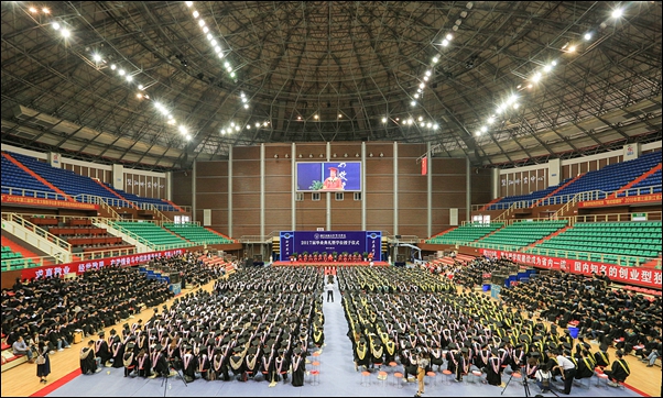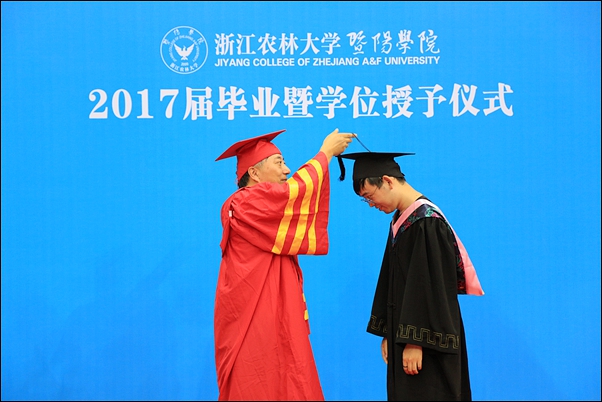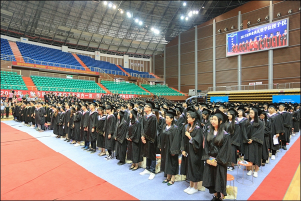 本网讯 6月15日上午,学院2017届毕业典礼暨学位授予仪式在体育中心篮球馆隆重举行。迁址诸暨办学后,在诸暨完成全部四年学业的1519名第一批毕业生齐聚一堂,寄语同窗,感谢恩师,话别母校。