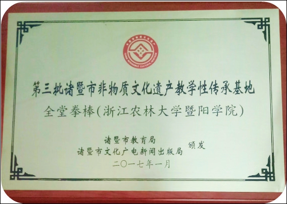 近日,诸暨市2017年“文化和自然遗产日”活动在市广播电视台演播大厅举办,第三批诸暨市非物质文化遗产“全堂拳棒”教学性传承基地正式落户必赢官网,诸暨市副市长俞越为基地授牌。