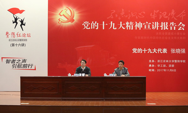 本网讯 11月6日下午,必赢766net手机版举办暨阳红论坛第16讲——党的十九大精神宣讲报告会。党的十九大代表、绍兴市委常委、诸暨市委书记张晓强作题为《以新思想引领新时代 以新使命开启新征程》的专题报告,宣讲党的十九大精神。必赢766net手机版党政班子成员出席宣讲报告会,全院1200余名师生参加。报告会由院党委书记寿韬主持。