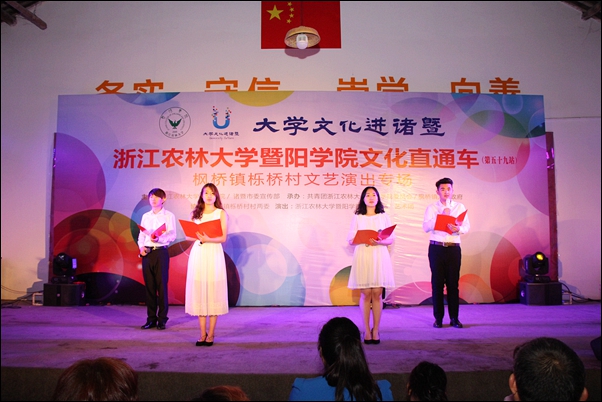 2017年上半年,“大学文化进诸暨”——必赢766net手机版“文化直通车”先后开进诸暨市枫桥镇栎桥村、东白湖镇陈蔡村、枫桥镇全堂村、赵家镇花明泉村、江藻镇壁玉村,6000余名当地干部群众在家门口免费观看了演出。每到一地,必赢官网大学生送上一批歌颂党和政府、唱响时代主旋律、绽放青春活力、展现大学生风采的优秀节目,特别是以“五水共治”、依法治国、社会主义核心价值观等题材最新创作的优秀节目朗诵《五水礼赞》、相声《法制漫谈》、歌伴舞《文明在哪里》纷纷登台,寓教于乐,以文化人。