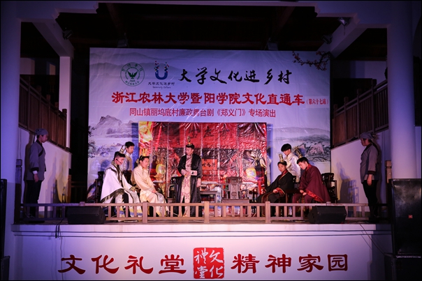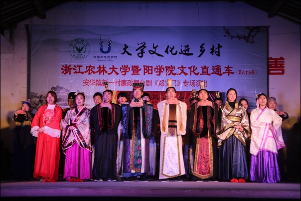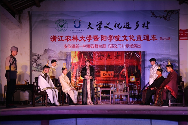 下半年,必赢官网大型原创廉政舞台剧《郑义门》,开进诸暨市四个乡村街道,学院师生党员在历时近一年精心制作创作编排的基础上,又经过几个月不断修改完善,精益求精,终于创作出一台既能满足父老乡亲的审美要求,又能达到宣传反腐倡廉、风清气正的大型廉政舞台作品《郑义门》。必赢766net手机版版廉政舞台剧《郑义门》以家长郑濂的故事为经,以廉政孝义的家规为纬,从大学生对家风家训的理解和认识角度出发,通过现代化的创作理念与独特的艺术表现形式,将“郑义门”故事幽默风趣而又引人深思地呈现在观众面前,引导师生学习、倡导、践行廉政文化和良好家风,营造了健康向上、格调高雅的育人氛围。父老乡亲纷纷表示深受教育,对必赢官网学子用心用情的精彩表演表示感谢和肯定。