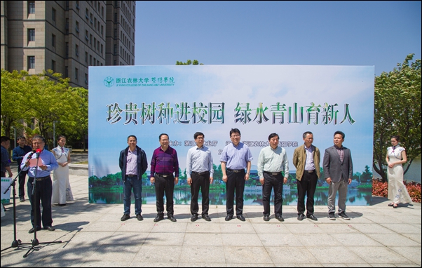 上午11时,以“珍贵树种进校园 绿水青山育新人”为主题、“珍贵树种进校园活动”暨学院珍贵树种植物园建设正式启动。石道金代表学院接受胡侠副厅长向学院赠送的“珍贵树进校园”赠苗清单。此次省林业厅共赠送第一批树苗:红豆杉、红豆树、浙江樟、浙江楠、花榈木、金钱松、福建山樱花、榉树、娜塔栎、舟山新木姜子、银杏等11个珍贵树种1200株树苗。