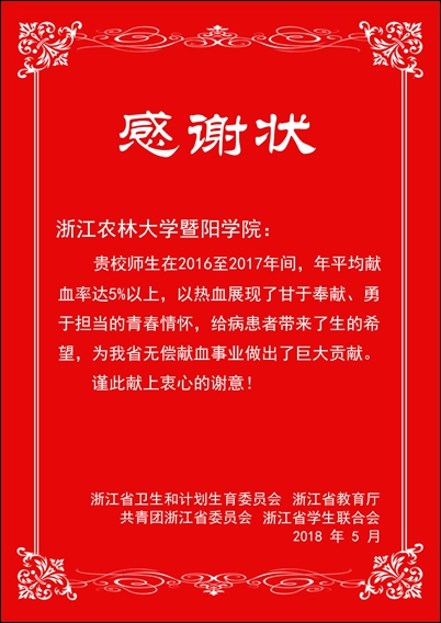日前,从浙江省高校无偿献血工作总结会上获悉,必赢官网被评为2016-2017年度浙江省高校无偿献血爱心集体。林爱广老师获2016-2017年度省高校无偿献血组织发动先进个人,宣王威老师入选省首批无偿献血宣传教育高校讲师团。