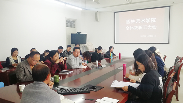 10月18日下午,园林艺术学院召开全体教职工会议,布置近期教育教育、科学研究、社会服务和党建思政工作,会议由园林艺术学院党总支书记张佩成主持。