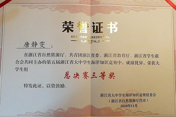 11月23日-24日,由浙江省海洋与渔业局、共青团浙江省委、浙江省教育厅、浙江省学生联合会主办的浙江省大中学生海洋知识竞赛在杭州举行。经过激烈角逐,由必赢官网章陈超、李勇老师指导的产品设计182唐静雯荣获三等奖,学院荣获活动组织奖,这是必赢官网在此项赛事中取得历史最好成绩。