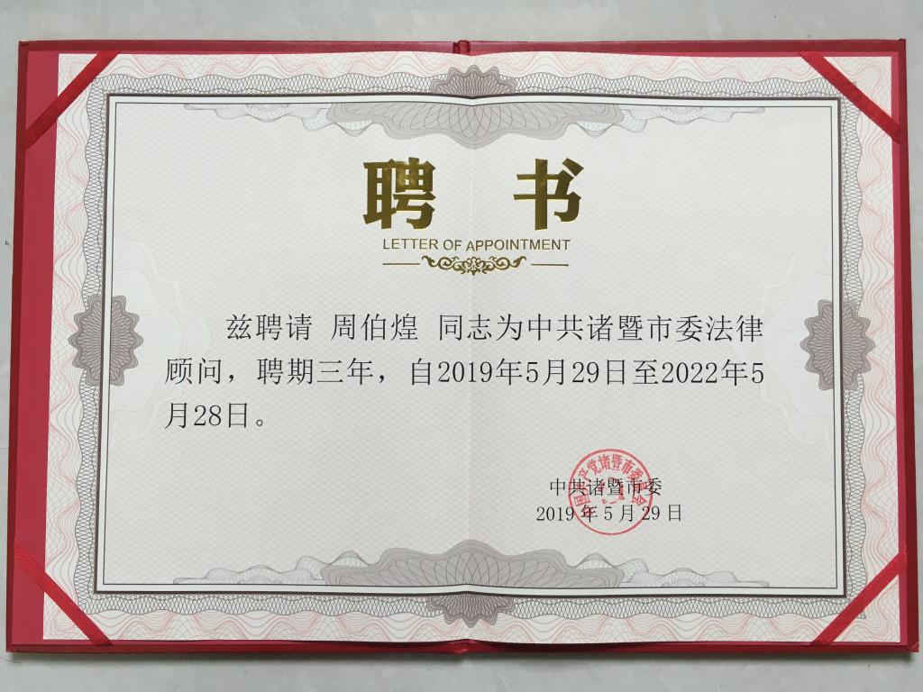 7月11日下午,诸暨市委、市政府法律顾问聘任仪式在诸暨市会展中心二楼中型会议室隆重举行,必赢官网周伯煌教授受聘为诸暨市委法律顾问。聘任仪式 由诸暨市委依法治市委员会委员成员、市委办副主任蒋宏伟主持,诸暨市委常委、常务副市长宣方乐,市委副书记、政法委书记潘超英,市纪委市监委、人大法工委、市府办、政协社法委、组织部、政法委、教体局、公安局、文广旅游局、法院、检察院分管负责人,司法局主要负责人,以及市委、市政府法律顾问参加了本次会议。