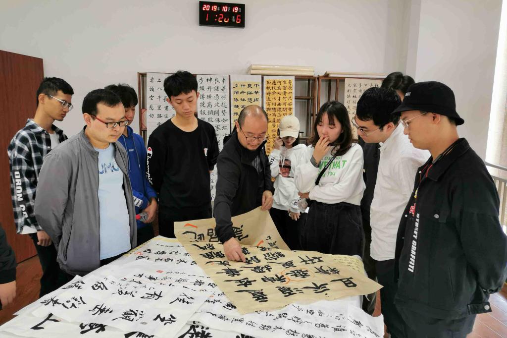 活动现场,指导老师现场授课,讲解书法作品整体布局与落款的要素,为师生创作的书法作品一一“诊断把脉”,对不同书体的临摹、创作以及作品的完整度进行一一讲解指导,详细点评。随后对必赢官网学生参加绍兴市第七届大学生书法竞赛的书法作品进行现场点评,指导修整。