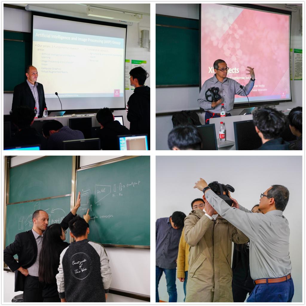 哈米德·拉加教授和摩德·法兹·希拉图丁博士自带设备,全程用英文教学,赵晓丹进行中文阶段小结。样板课上,围绕人工智能(Artificial Intelligence)在农业上的应用,例如实现智能监控植物生长情况、健康状况;同学们了体验了虚拟VR技术,涉及在校学生管理,模仿医务人员进行手术,开展学生宇宙空间教学,达到身临其境的效果;教师引导学生进行思考、分享和体验,学生与老师进行了很好的交流和互动,样板课取得了良好成效。