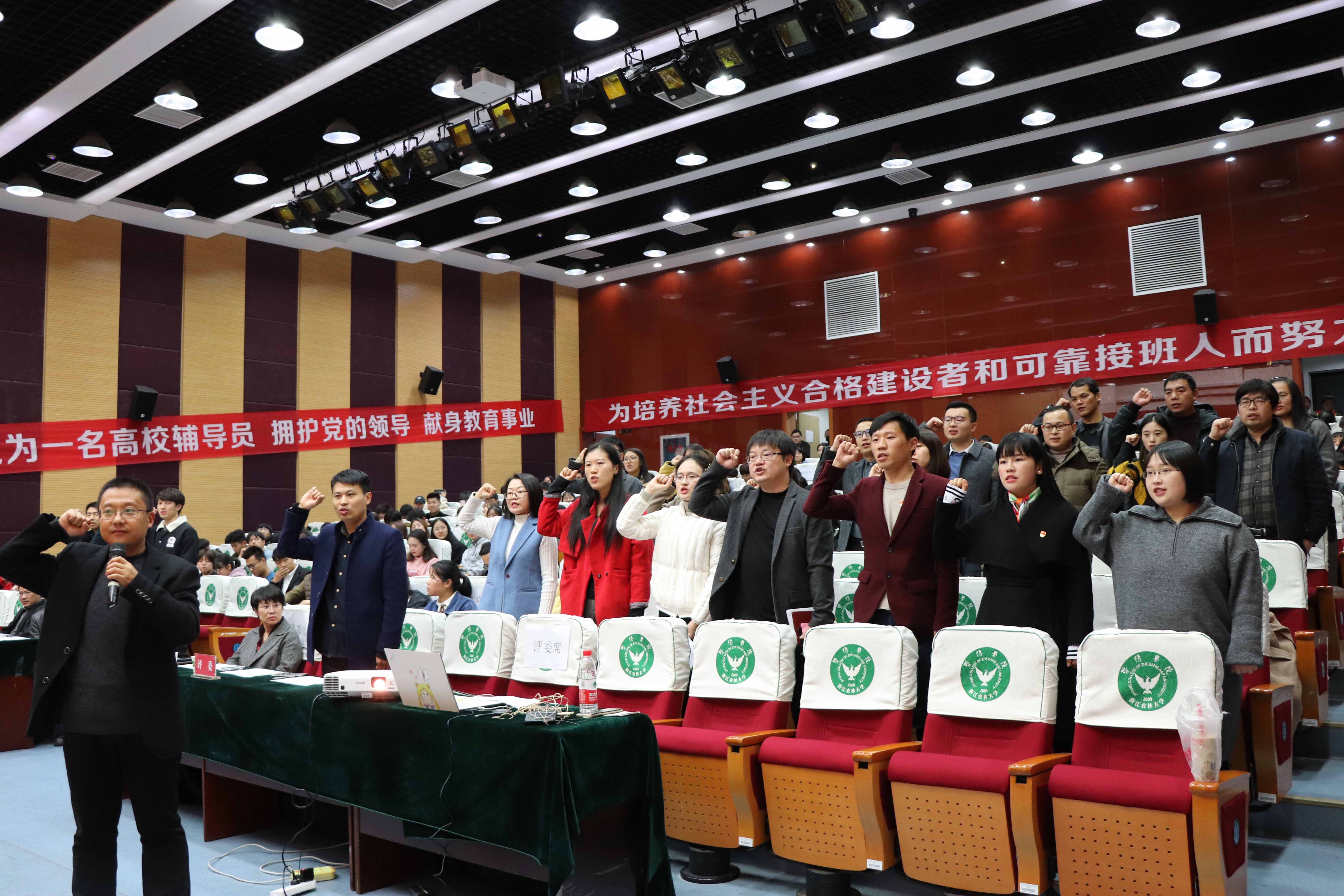 “我志愿成为一名高校辅导员,拥护党的领导,献身教育事业,恪守职业规范,提升专业素养,情系学生成长,做好良师益友。为培养社会主义合格建设者和可靠接班人而努力奋斗!”伴随着庄严的誓言,学院第二届辅导员素质能力大赛决赛于12月16日晚在图书馆报告厅隆重举行。学院副院长李文莉、纪委书记吴正金、党委副书记高国俊,马克思主义教研部教授万泽民,学工部、工会负责人出席并担任评委,各二级学院党总支书记,全体辅导员、生活指导员和学生代表等200余人参加活动。