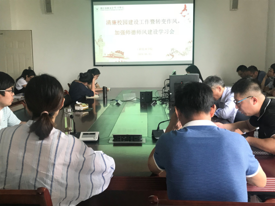 全体教职工集中观看了以省教育厅高等教育处原处长违纪违法案件等为典型的《反腐前线》警示教育片,全体人员深为震撼、深受教育,大家纷纷表示要保持清正廉洁,常怀律己之心,防微杜渐,自觉筑牢思想防线。党总支副书记马忠兴和学院办公室主任覃文芳围绕会议主题分别作了交流发言。
