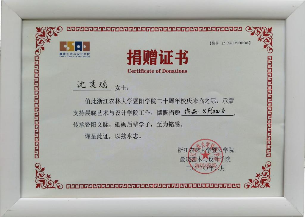 在学院二十周年院庆之际,我很荣幸能把这件诠释着自我创新的作品回馈给晨晓艺术与设计学院,同时希望它能载着我对院校的眷恋与两载光阴的铭心记忆,将我美好的时光保留下来。我受院校与老师们的教育之恩,才有足够的思维和能力去做出属于自己的毕设,所以这次的捐赠既是对院校的回馈,又是对自己的认可,时间最终将我的大学生涯定格在2020年,但我庆幸晨晓艺术与设计学院为我插上了艺术的希翼。