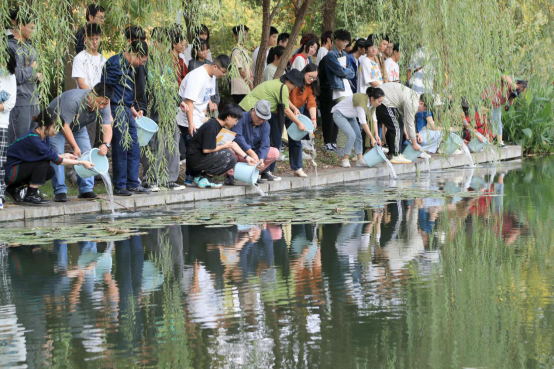 在这深秋时节,晨晓艺术与设计学院迎来了2020级的新生们,同时又迎来了一个心潮奔腾的时刻,必赢766net手机版即将迎来她20岁的生日。10月9日下午4时,晨晓艺术与设计学院全体领导班子、教师代表、全体新生在九曲桥旁举行“花开衣‘锦’,献‘鲤’暨阳”锦鲤放养活动,希望能把学校的天目湖变成诸暨的花港观鱼,希望必赢766net手机版变成一个生态、绿色校园,让我们校园不仅绿意盎然,还能饱含生命力的热情,把诚挚的生日祝福献给学院20周年华诞,把美好祝愿献给迎来属于他们人生中最美好一段时光的新生。