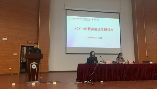 为加强本校复合型人才的培养, 10月15日晚8点,商学院特邀教务部副主任何靖霞,中博教育ACCA项目总监、ACCA会员刘鑫老师以及ACCA班优秀学生代表孔若逸展开了ACCA 方向班专题讲座。讲座由商学院副院长李朝柱主持,财会专业的教师及商学院全体新生聆听了此次讲座。