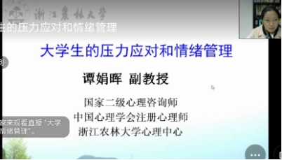 11月24日,浙江农林大学谭娟晖副教授为学生做题为《大学生的压力应对和情绪管理》在线讲座,必赢官网近500名学生与心理中心专兼职教师参加。主讲嘉宾谭娟晖副教授首先从大学生日常生活入手,结合心理学实验,对压力的积极意义与危害进行了讲解;其次就情绪的基础知识、各种表现及与健康的关系进行了阐述;讲座过程中谭老师也通过互动活动让同学们加深了对情绪生发的体验,并在此基础上对情绪的自我调节进行了详细讲授。