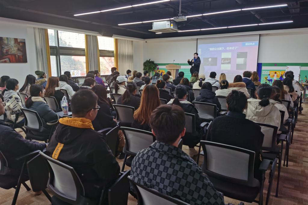 此外,基地的培训部负责人还为同学们准备了一场干货满满的专业培训,详细介绍了直播电商的现状,以紧跟热点为切入口,阐述了内容创作的重要性、直播带货的流程、账号运营等全方位内容,让同学们更加深入了解直播电商的运作方式。