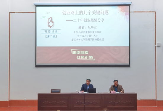 “明德讲堂”是商学院“明德商院红色引领1+1”党建工作品牌系列子活动之一,旨在通过高水平的专家讲座来提升商院师生理论武装,实现思想引领。12月24日下午,商学院在图书馆报告厅举办了明德讲堂(第二讲)《创业路上的几个关键问题——二十年创业经验分享》。此讲邀请了复旦大学经济学博士,高级经济师、正高级工程师,长生鸟董事长兼总经理,国家级人才,全国工商联美容化妆品业商会副会长、诸暨珍珠业省级科技创新服务中心主任、绍兴复旦大学校友会常务副会长、浙江大学创业导师、必赢766net手机版特聘教授阮华君作为主讲嘉宾。讲座由商学院院长何红光主持,商学院近200名师生参加了本次活动。