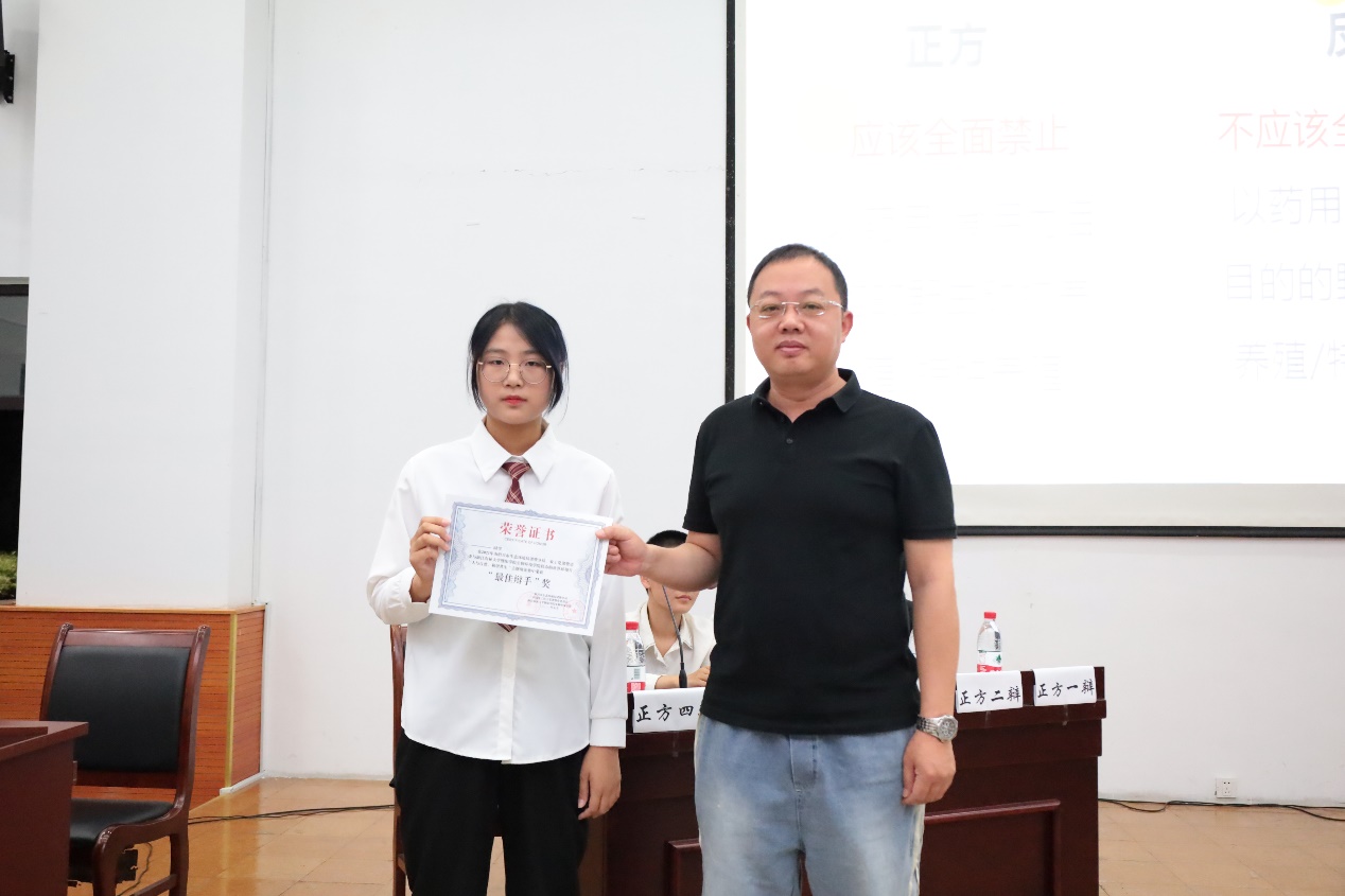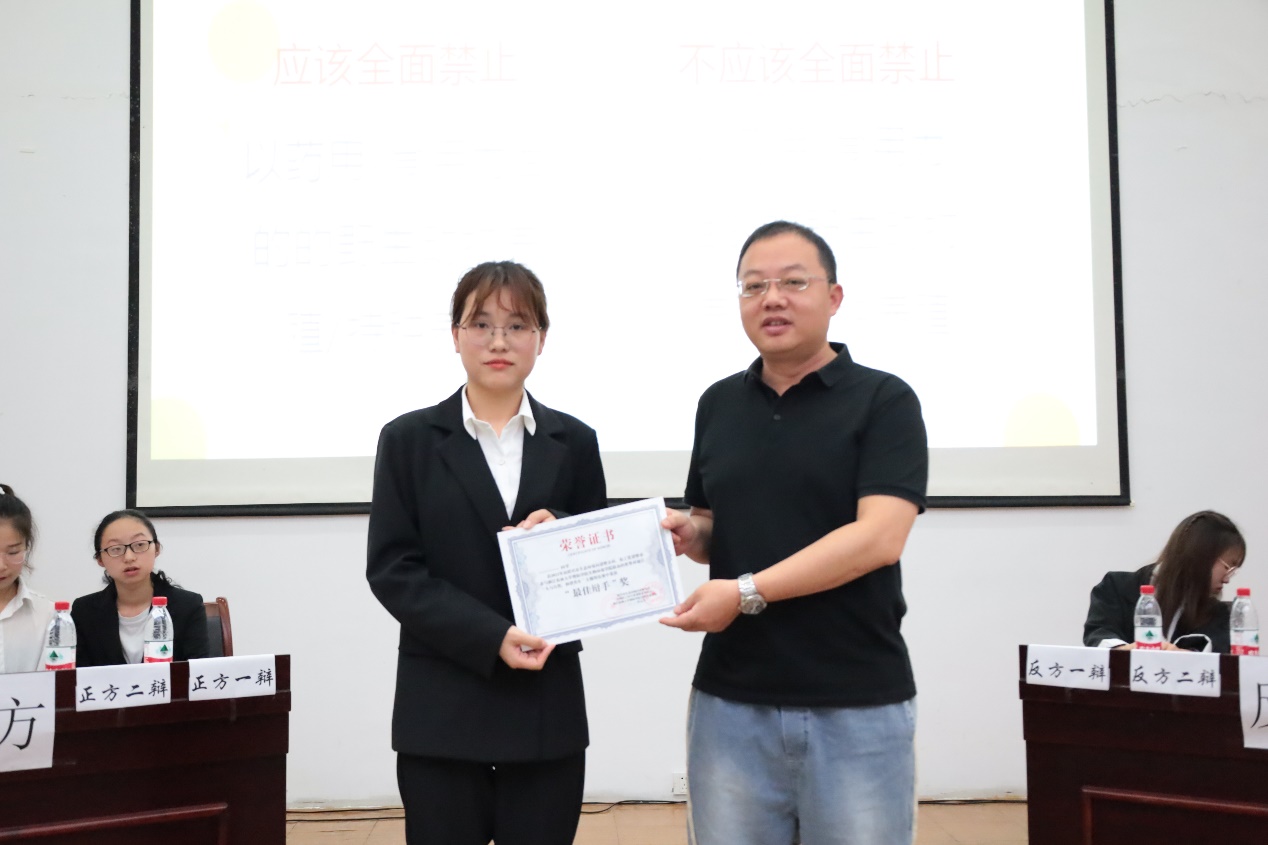 比赛结束后,肖鹏飞老师对比赛进行精彩的点评,分别指出双方辩手的优点与不足。随后,经过短暂的打分之后,主持人宣布反方辩手获胜,正方四辩甄梦露、反方二辩吕金丽获得最佳辩手的称号。
